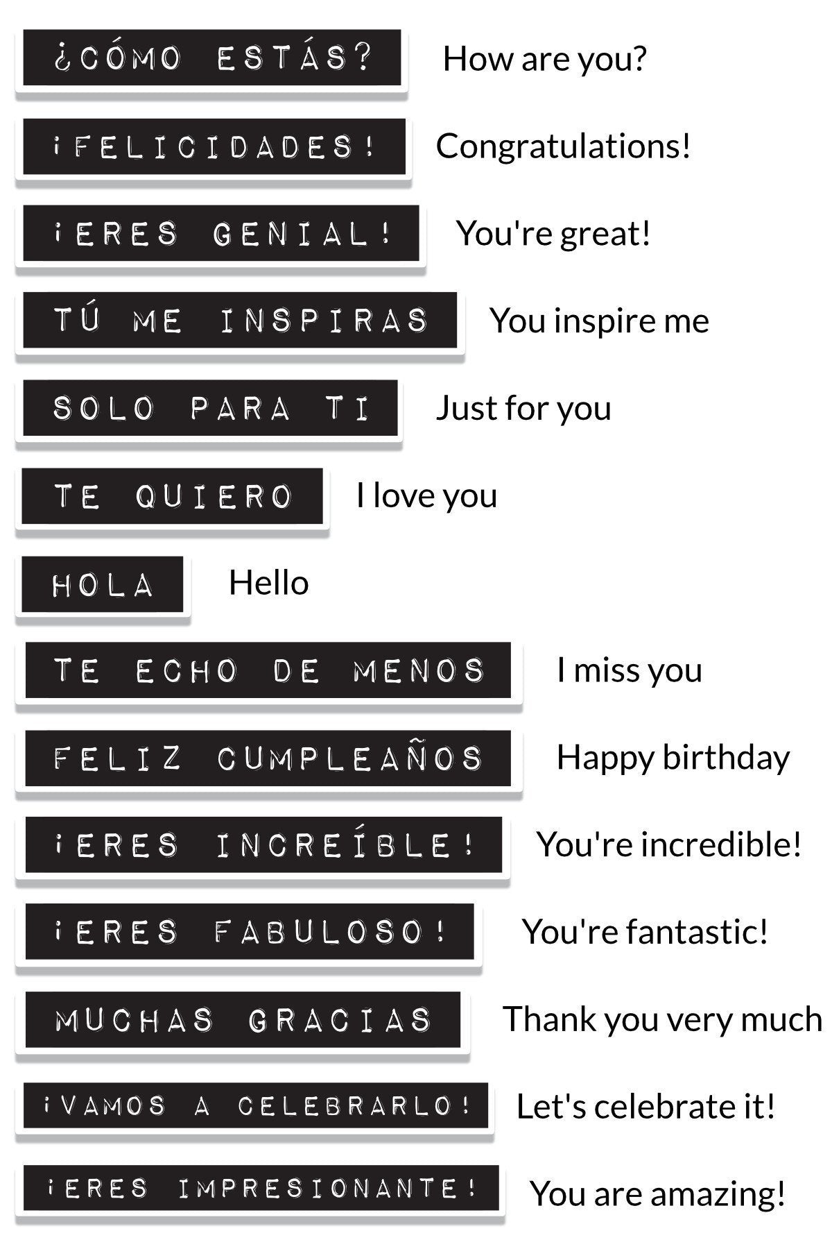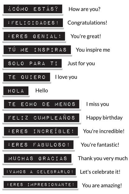 Motivstempel Set bestehend aus 14 Labels mit Texten wie:"HOLA", "SOLO PARA TI", "TE QUIERO" usw.