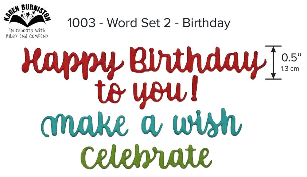 Karen Burniston Stanzen sind innovativ und vielfältig. Sentimente "Happy", "Birthday", "to you", "celebrate", "make a wish" und ein Ausrufezeichen. Passend zu Geburtstagskarten.