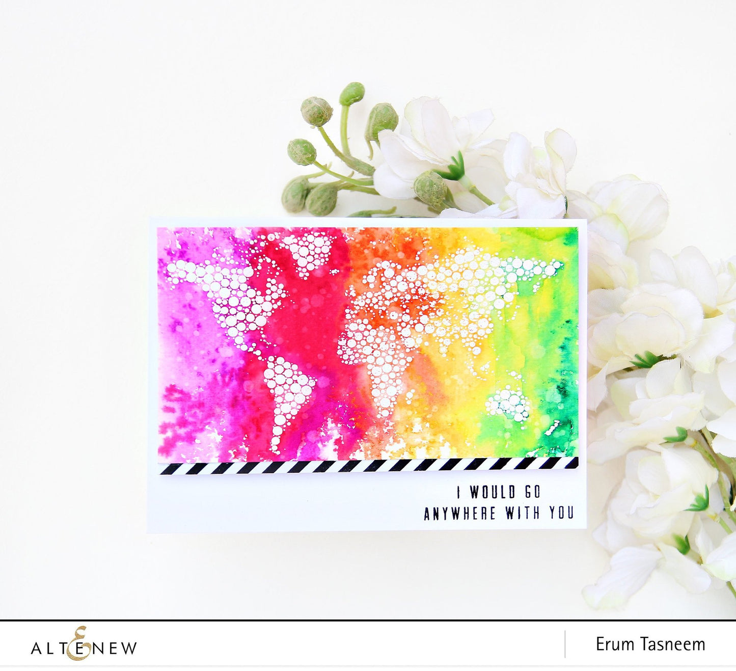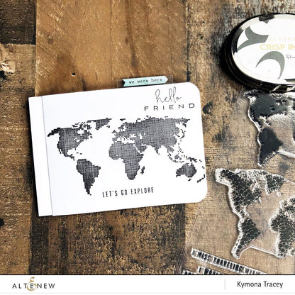 Das Set enthält zwei Weltkarten. Das eine wird mit Kreisen in verschiedenen grössen und das andere aus vielen kleinen Vierecken dargestellt. Beide sehen jedoch ob gstempelt oder embossed sensationell aus. Zusätzlich dazu spendet Altenew fünf passende Sentimente passend zum Thema Reisen und Freundschaft.
