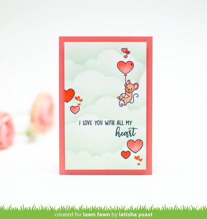 Ideen für passende Sets: Erstelle einen Tintenhimmel mit den Schablonen "Cloud Background" und "Falling Hearts", um die Szene für deine schwebende Maus mit Luftballons zu setzen! Füge mehr Freunde mit unserer Kollektion "Mice are so cute!" hinzu!