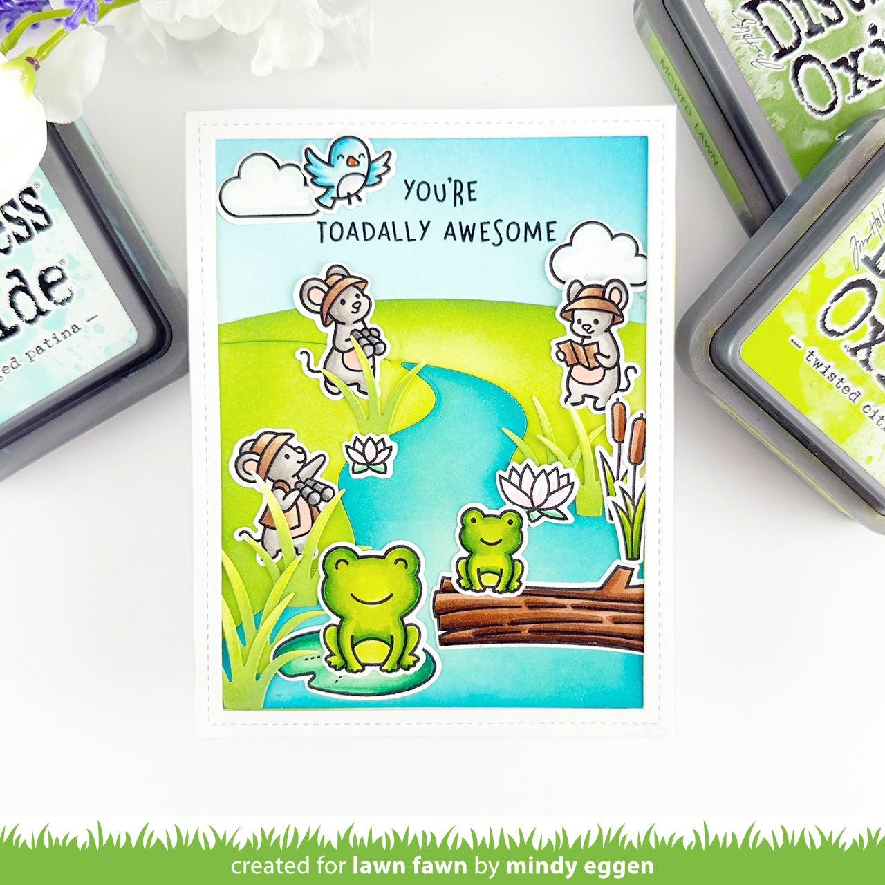 Schaffe mit dem Riverside Backdrop: Portrait Set von Lawn Fawn eine charmante Flussufer-Ansicht im Hochformat.