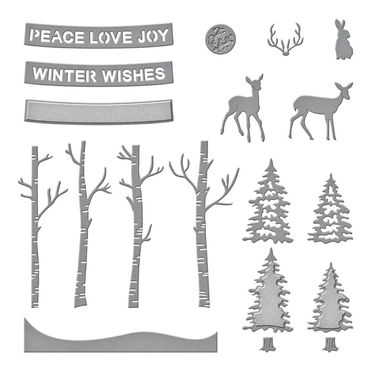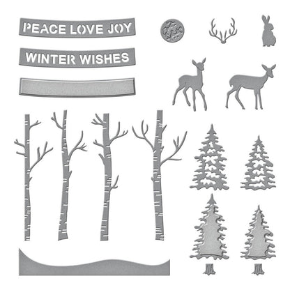 Die Woodland Scene Etched Dies sind Teil der Simon's Snow Globes Kollektion von Simon Hurley. Dieses 15-teilige Set aus dünnen Metallstanzformen ergänzt Simon's Snow Globe Etched Dies (S6-222) um eine idyllische Waldszene. Enthalten sind hohe Birken, Hirsche, Tannen und mehr. Zwei sentimentale Sprüche, "Winter Wishes" und "Peace Love Joy", vervollständigen das Set. Perfekt zum Kombinieren mit weiteren Szenen-Sets der Kollektion!
